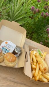 最後に訪れたのはイギリス館の近く。テイクアウトのブースでスコーンとフィッシュアンドチップスを購入し、夕方の風に吹かれながらゆっくり味わいました。特にポテトの味がとても良く、良い締めくくりとなりました。