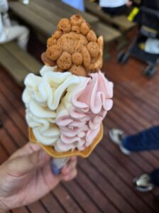 続いてスペイン館を訪れ、その後、子どもたちのリクエストで「らぽっぽ」のソフトクリームとかき氷を。