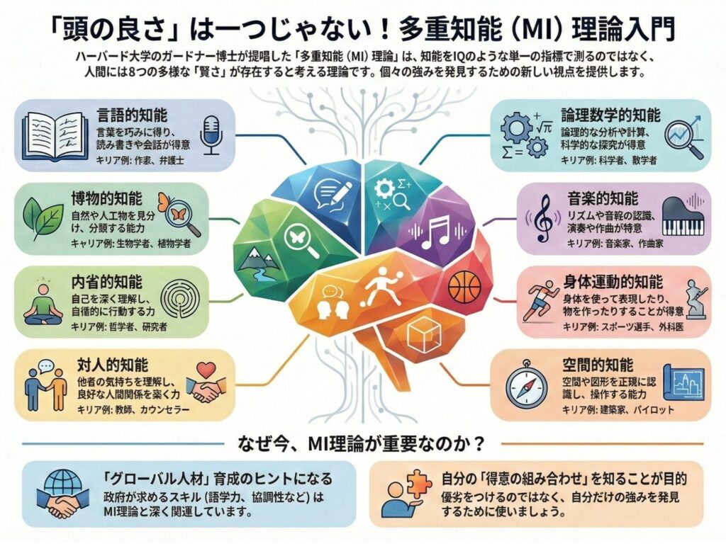 【図解】「頭の良さ」は一つじゃない!多重知能(MI)理論の8つの知能とキャリア 「頭が良い」と聞くと、どんな人を思い浮かべますか? 計算が早い、記憶力が良い、いわゆる「IQ(知能指数)が高い人」をイメージすることが多いかもしれません。 しかし、... -