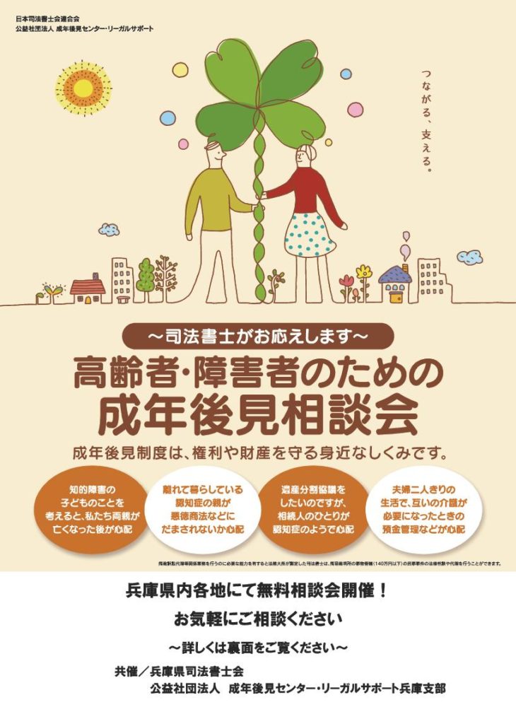 このたび、 兵庫県内各地で成年後見相談会が開催されます。 本相談会は、 成年後見制度の利用を考えておられる方のため、 司法書士の団体が毎年無料で催しているものです。 以下のようなお悩みのある方は、 ぜひ会場まで足をお運びください。 知的障害の子...